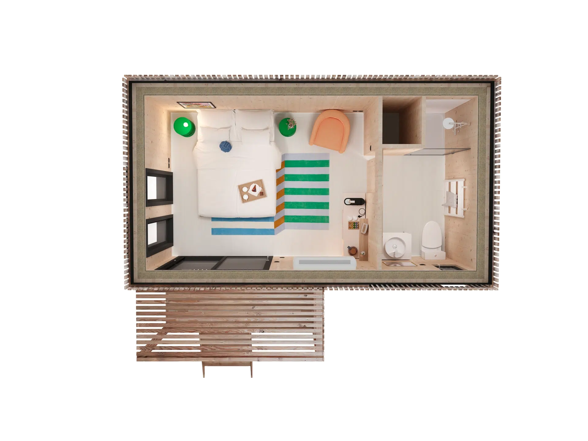 Le GK15, un studio de jardin compact permettant d’accueillir salle de bainWC et cuisine. Son format discret s’intègre harmonieusement dans tous les jardins, offrant un espace cosy et autonome pour un adolescent en quête d’indépendance, un projet locatif permettant d’accueillir un couple, ou encore pour un bureau professionnel ou personnel.