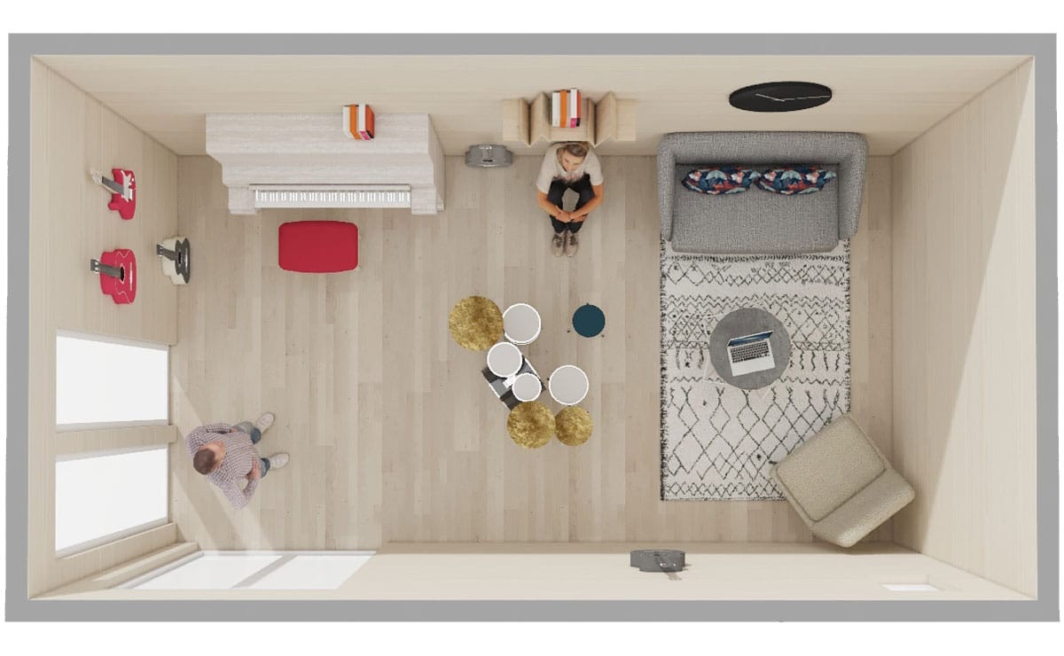 En créant ce lieu supplémentaire pour votre passion, nous pensons à utiliser des matériaux de haute qualité et à faire une pièce avec un beau volume. Vous avez ainsi toute la place pour vous exprimer, vous étaler et profiter de votre musique.