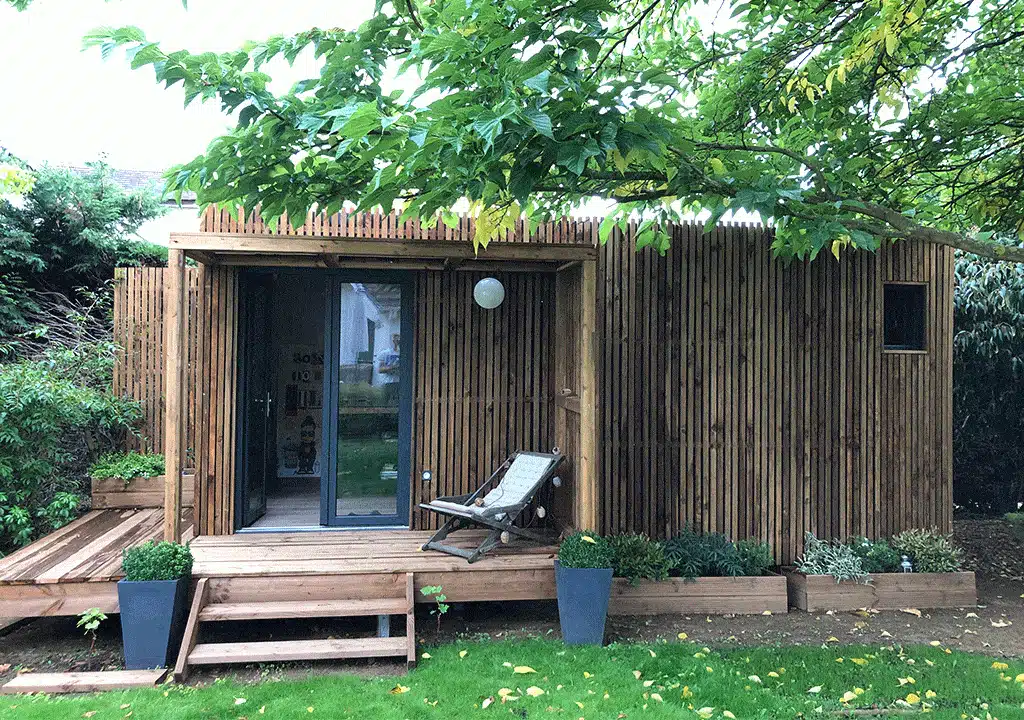 Dans l’Essonne, Marc, client Greenkub, a transformé un studio bois de 20 m² en une salle de dessin baignée de lumière. L’atelier d’artiste s’ouvre sur une terrasse prolongée, ponctuée de jardinières qui relient naturellement la création à la nature et invitent au dessin en plein air.