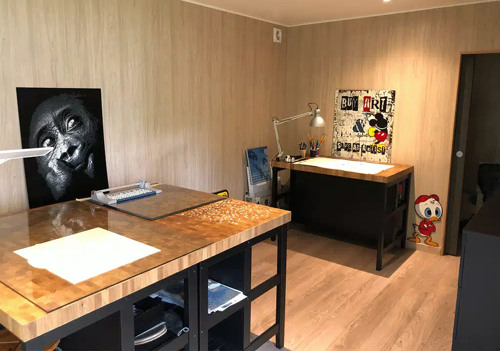 Pensé pour stimuler la créativité, l’aménagement intérieur privilégie les volumes clairs, la circulation fluide et des rangements dédiés au matériel artistique. De grandes ouvertures cadrent le jardin et apportent une lumière naturelle régulière, idéale pour le croquis et la mise en couleur.
