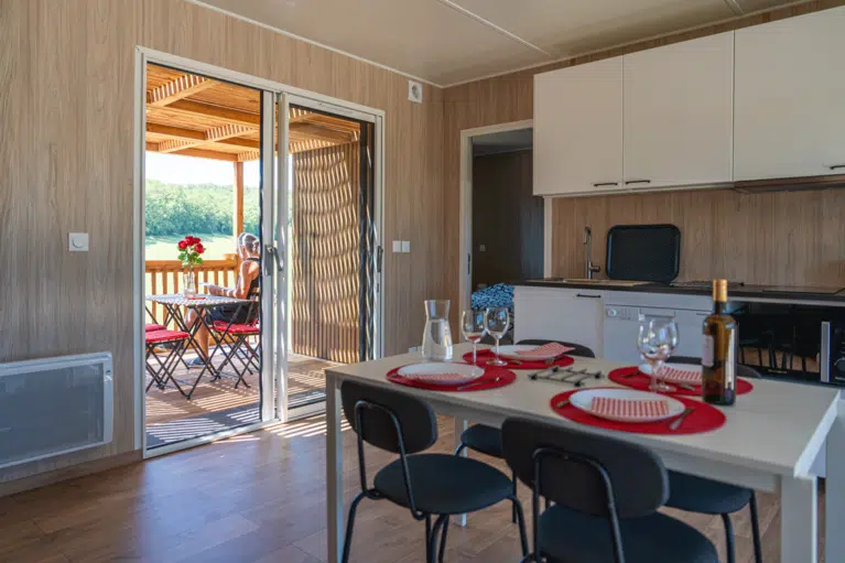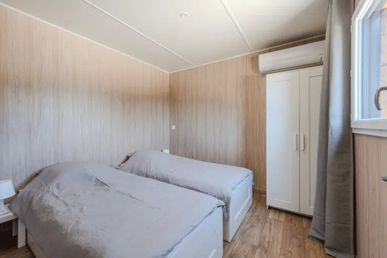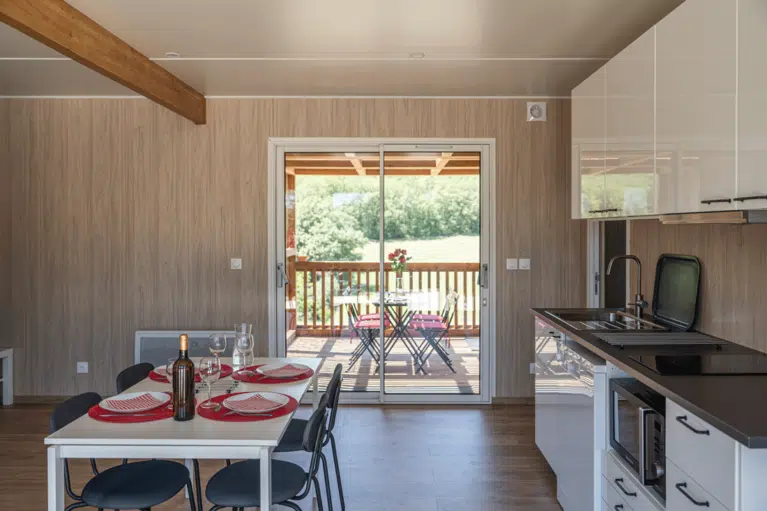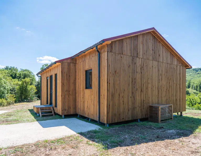 Cette construction en ossature bois associe une charpente bois soignée et un bardage bois durable. Les parements en bois massif signent une esthétique contemporaine, loin de la fuste traditionnelle, tout en s’intégrant harmonieusement au paysage. L’aménagement optimise chaque mètre carré pour accueillir les voyageurs dans d’excellentes conditions.