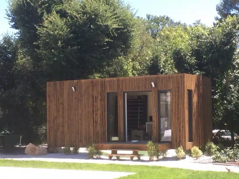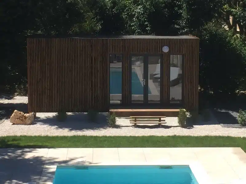 Pensé pour le confort, l’intérieur peut accueillir un salon d’été, un coin bar/cuisine d’extérieur, un espace de rangement technique pour la piscine, voire une douche. Sa modularité permet d’en faire, au fil des saisons, une salle de jeux, une salle de sport à domicile, un studio de musique à domicile, une chambre d’amis ou un bureau de jardin. Ce 20 m² offre la flexibilité d’une micro‑extension de qualité professionnelle, avec la même rigueur qu’une maison individuelle bois.