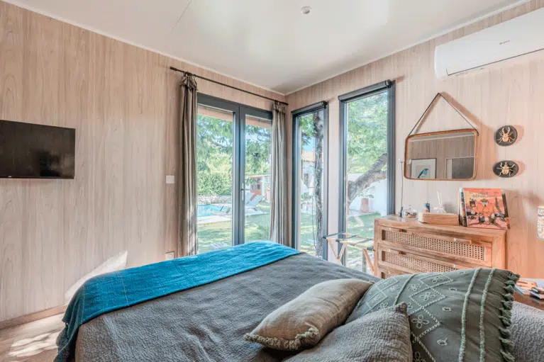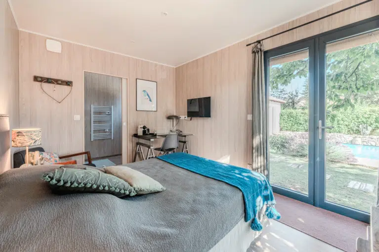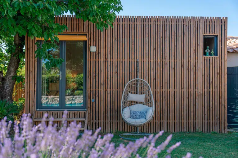 Projet client réel: Patty a installé un studio de jardin GK15 de 15 m² dans les Bouches-du-Rhône pour créer une chambre d’amis cosy et indépendante. Conseillée par notre architecte-conseil, Mme Bailly, elle a imaginé un espace discret au bord de sa piscine, pensé pour accueillir famille et amis tout en préservant l’intimité de la maison principale.