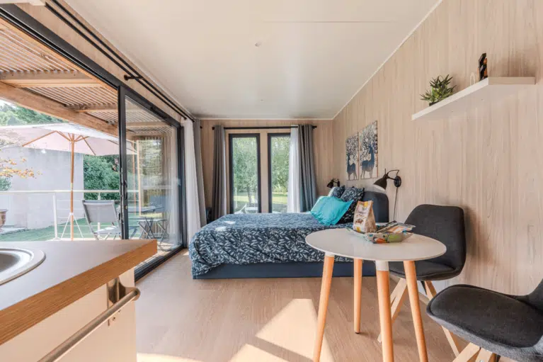 Un espace polyvalent. Conçu d’abord comme chambre d’amis, ce studio de 20 m² peut évoluer en bureau de jardin, studio étudiant, chambre d’hôtes, atelier d’artiste, salle de jeux, salle de sport à domicile, voire cabinet de praticien. La modularité de l’ossature bois et la qualité de la préfabrication permettent d’anticiper plusieurs usages sans compromis sur le confort.