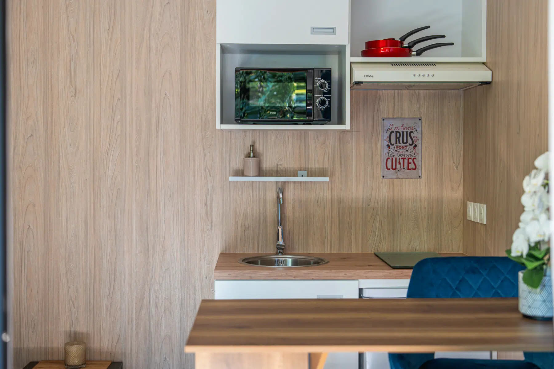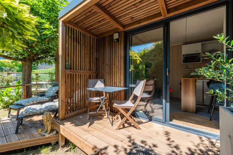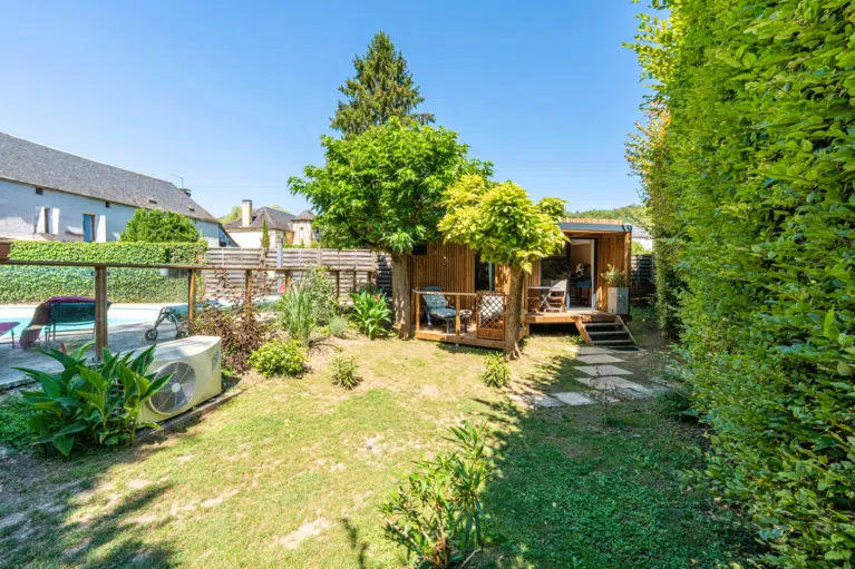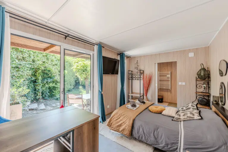 Le studio de 20 m² est optimisé pour la location saisonnière: coin nuit, salle d’eau, kitchenette et baies vitrées ouvrant sur le jardin. Grâce à sa performance énergétique, les charges restent faibles, un atout clé pour la rentabilité. Implanté en Dordogne, au cœur du Périgord, ce type d’hébergement attire les voyageurs en quête de nature près de Périgueux, Bergerac ou Sarlat-la-Canéda.