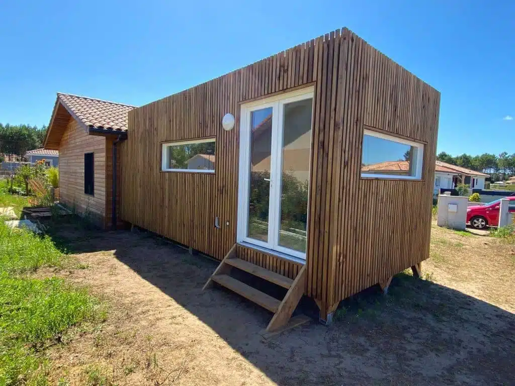 Notre client landais a souhaité un espace autonome et fonctionnel. L’aménagement optimise chaque mètre carré: zone nuit confortable, rangements intégrés, éclairages bien étudiés et une salle d’eau selon configuration. L’implantation à proximité de la maison individuelle préserve la convivialité tout en garantissant l’intimité des invités.