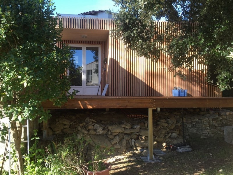 Côté technique, la construction en ossature bois et charpente bois assure légèreté, robustesse et durabilité. Le bardage bois et une étanchéité soignée protègent efficacement l’ouvrage. Préfabriqué bois en atelier puis livré en kit bois, le projet bénéficie d’une construction rapide et clé en main, limitant les nuisances sur site. Une étude de sol a permis d’adapter les fondations (plots ou semelles) au terrain héraultais pour une implantation pérenne.