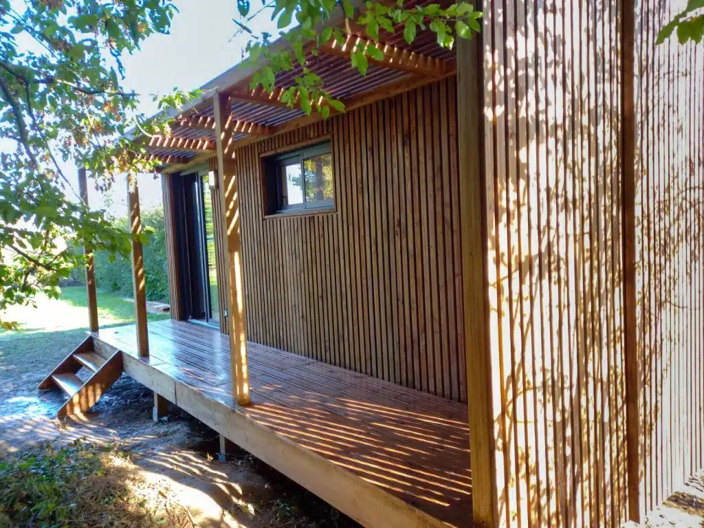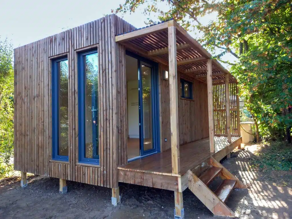 Conçu par le leader français de la construction bois, ce studio combine charpente bois et bardage bois durable, avec une préfabrication en atelier (préfabriqué bois / kit bois) pour une construction rapide et clé en main. L’ossature bois optimisée garantit une excellente stabilité et un montage maîtrisé, tandis que des éléments en bois massif apportent une touche chaleureuse. Contrairement à la fuste (construction en rondins), ce projet privilégie une architecture contemporaine, légère et performante.