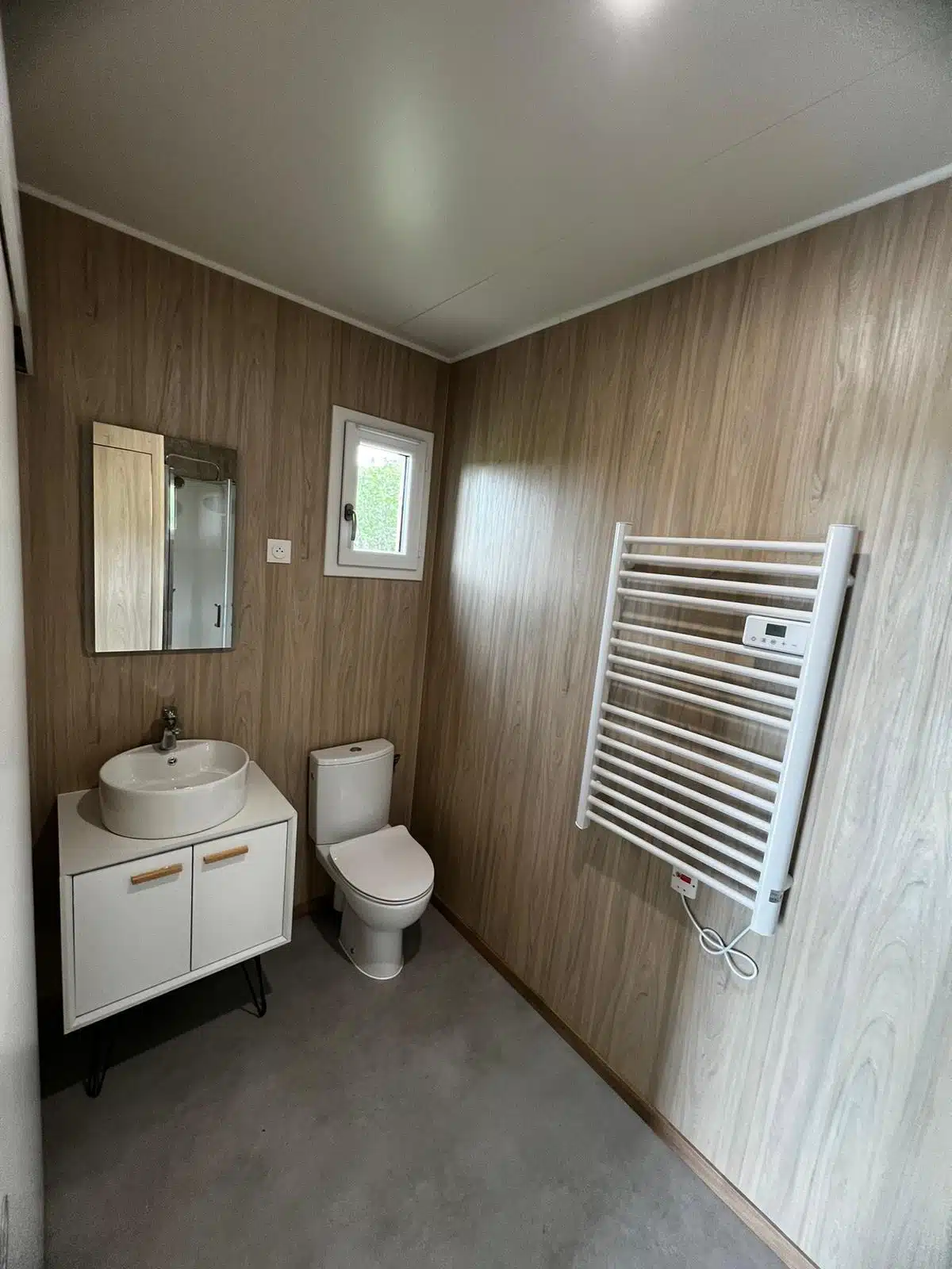 Inspiré des principes maison passive et conforme aux exigences RE2020, l’enveloppe performante, l’étanchéité soignée et les menuiseries à haute performance énergétique limitent les déperditions. Une conception biosourcée réduit l’empreinte carbone par rapport à une solution maçonnée, tout en offrant un climat intérieur stable pour travailler et se reposer.