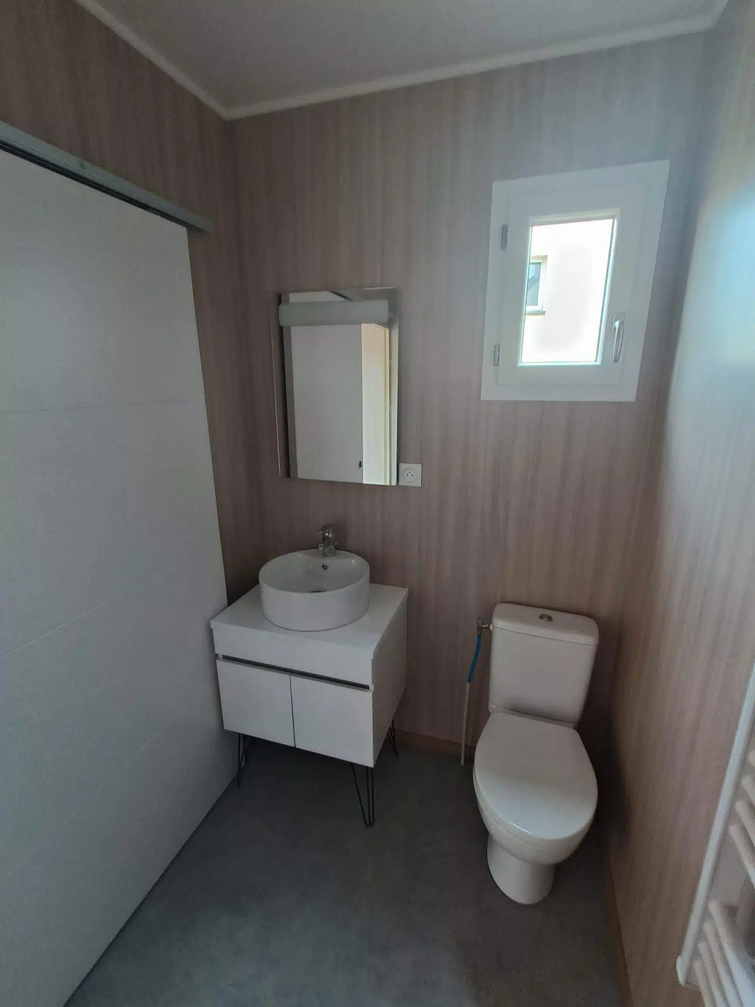 Conçu pour répondre aux attentes de la RE2020, le studio privilégie la performance énergétique: isolation optimisée, menuiseries performantes et équipements économes. Le choix du bois massif et une conception inspirée des principes de la maison passive limitent l’empreinte carbone et favorisent une construction durable.